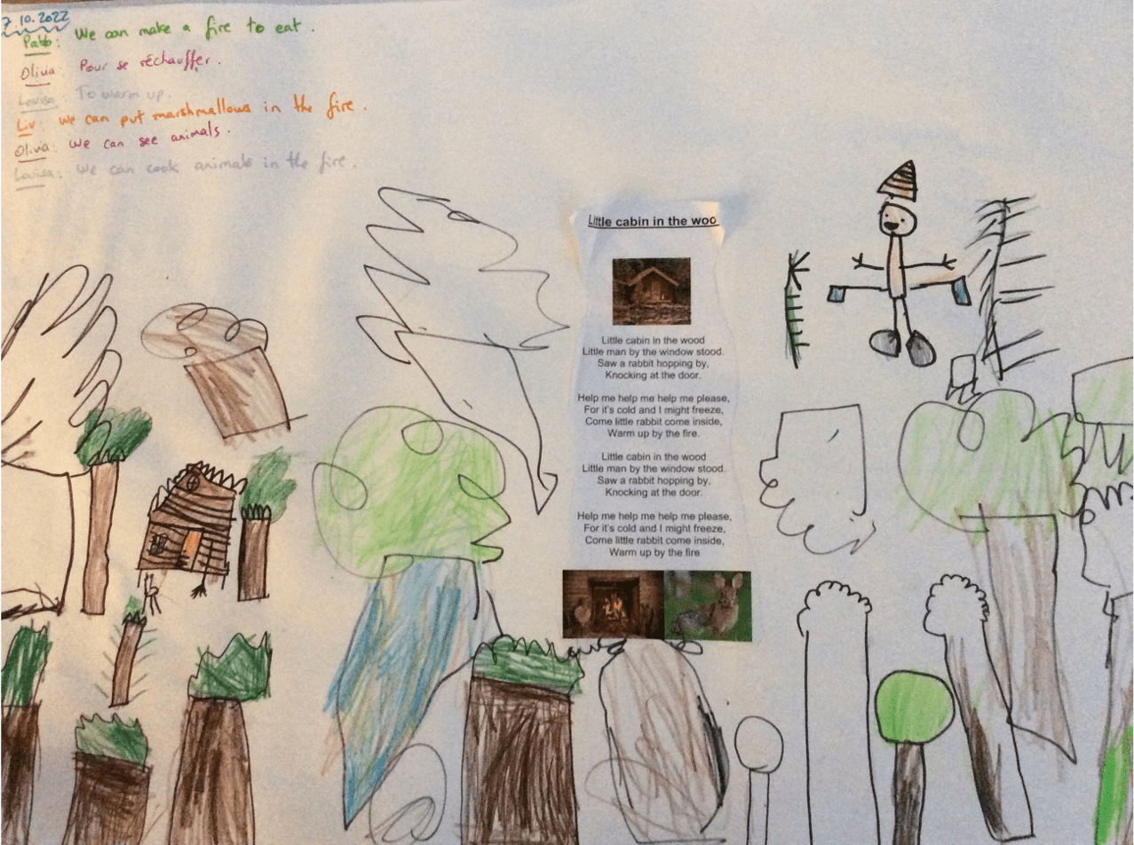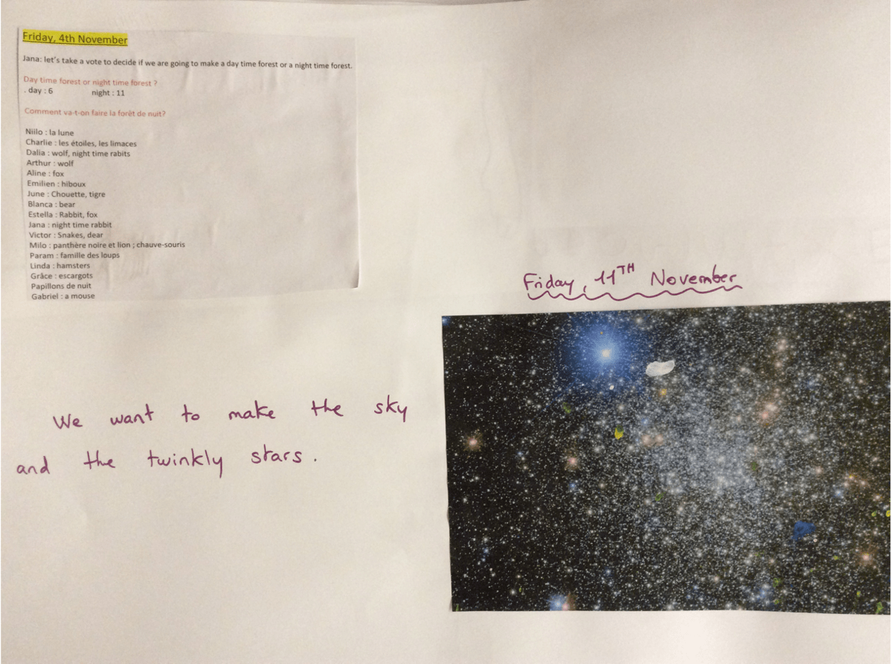 Each year the class note down their ideas in a project book. Out of these ideas a project emerges. In the flying squirrels they have been working on poetry. The Rabbits have been planning to build their own house in the forest. The Butterflies would like to go to the forest at night. Here are some examples of the pages in the book. They are available in to read in the class spaces.
